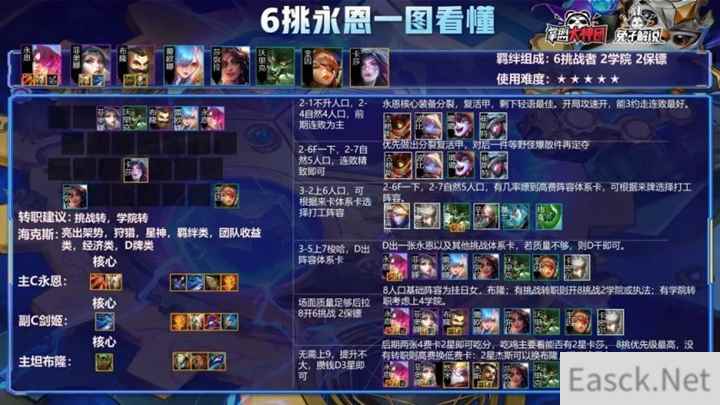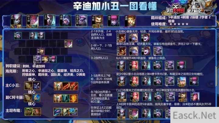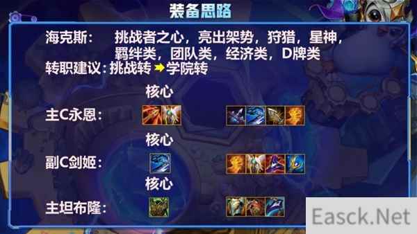主C永恩: 分裂,复活甲为核心,分裂配和永恩残影可打出一剑4破,将输出最大化,即使对面前排很肉,凭借残影杀后排,也可刷出挑战被动。复活甲保证容错,且永恩有复活甲的情况下,即使被打掉,影子出来可以打出伤害,这就是永恩配和复活甲的强势之处。第三件最好做轻语,随着法师的削弱,现在人手一件反甲,如果直接出无尽的话,很难清理前排。实在做不出轻语的情况下,正义,巨杀都可以带,只不过比较怕保镖了。 副C剑姬: 随着版本更新,剑姬大幅加强,配和6挑战,剑姬输出也不压于永恩。首装推荐,正义,提高伤害与续航,剩下两件可做法系装备,也可做攻击装备,甚至分裂都可以带,因为剑姬技能也可出发分裂。 主坦布隆: 推荐首装狂徒,提高血量的同时能防止C位被执法,其次反甲,针对版本崛起的刺客,最后根据场外情况来挑选装备。法师多则补龙牙,自身阵容没有直击弱点或者其他减疗装备则给布隆带鬼书。 挑战永恩推荐海克斯: 挑战者之心,亮出架势,狩猎星神,羁绊类,团队类,经济类,D牌类 双人推荐海克斯:潘多拉,存心失利,打捞桶,DD街区,利滚利,黄金门票,高端购物。 运营详解 辛迪加刺客运营节奏: