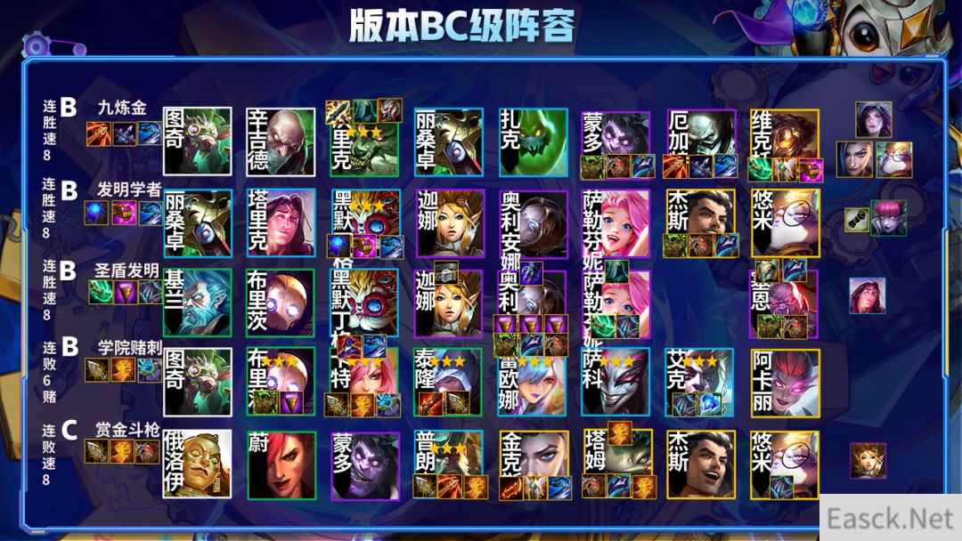 版本综合胜率低于48%的B级阵容,九炼金主要是外服算法问题,天胡的炼金和狼人一定还是强,发明学者因为节奏问题弱势是正常的,圣盾发明是版本被砍的最狠的阵容,赌刺就像兔子说的,加强卡特的血量是要卡特的命,赏金斗枪天胡赏金肯定还是不错的。 |