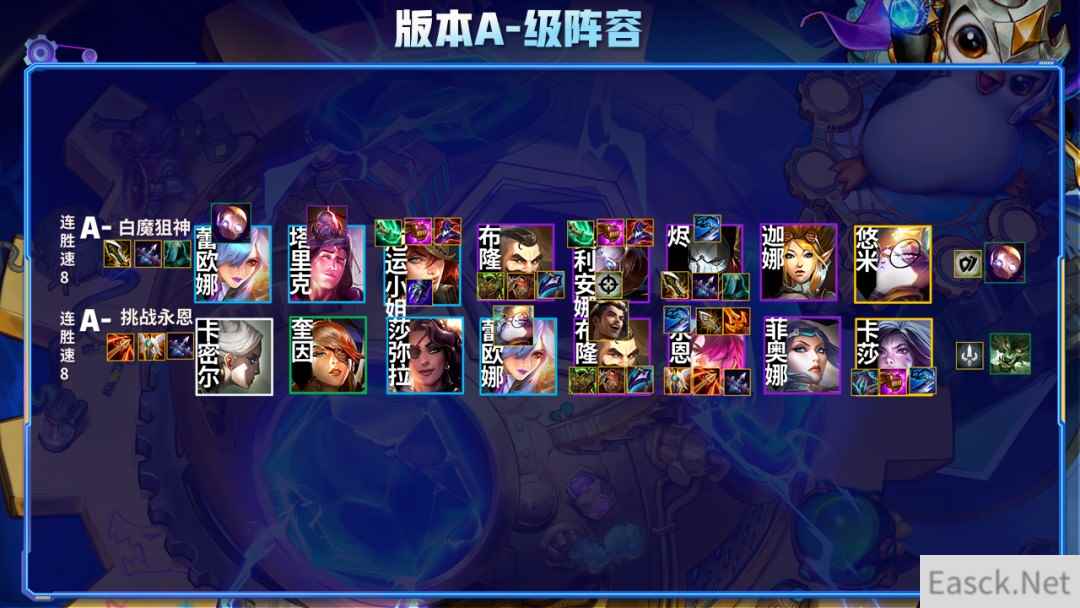 版本综合胜率略低于50%的A-级阵容有两个,老牌阵容狙神和永恩,狙神可以说被砍的最多,而且最怕的就是帝国刺,永恩胡8挑战还是很强的,版本没砍什么。