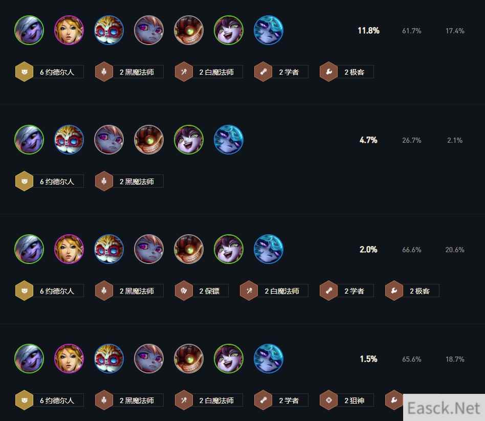 国服榜单的好处就是国服榜特别的细致,能够精准的算出某一种阵容的具体数据,就是数据量级极大,要根据阵容的经验一个个的去计算阵容的答案在哪里,大家设计阵容的时候都可以先去国服榜计算一下作为参考,缺点是时间及时性比较差,另外就是拼多多羁绊算不出来,比如2保镖1巨像这种数据国服榜单没有,除非阵容包含一个3白法这样的大羁绊才可以计算。