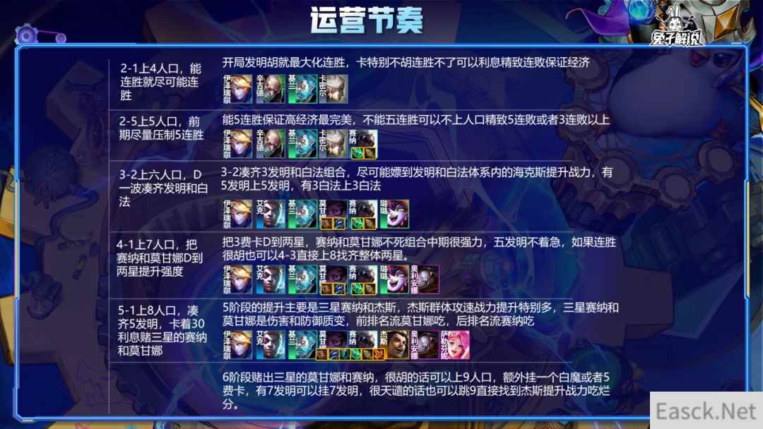 发明转需要9人口才能挂齐或者下发条 白发转的提升很不错 整体不刚需转职更想要战力加成海克斯 站位解析: 集体沉底扎堆即可,这样杰斯攻速最大化,因此比较怕执事学者,需要错开站位,赛纳和辛德拉同方向,最后一排人数不是最多或者上个伏击。