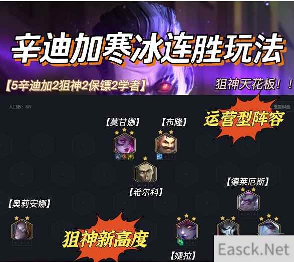 1.【5辛迪加2狙神2保镖2学者】 前期用2保镖2狙神打工,五人口上婕拉补3辛迪加羁绊,3-2上六人口!囤50金币慢慢用利息搜牌,优先找三星寒冰,其次是三星婕拉!血量稳定后可以考虑上七人口提升莫甘娜质量~优先在上八之前找到三星寒冰+二星莫甘娜! 八人口可以考虑替换烬+奥莉安娜!如果有狙神转职可以再加一个泽丽凑4狙神~ 2.海克斯推荐 狙神之巢、羽量级选手、狙神之心、辛迪加之心、后排之迅、直击弱点
