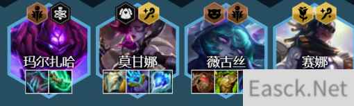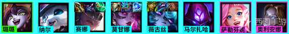 4、装备搭配: 【主C赛娜】:青龙刀+无尽+破甲弓/巨杀 【副C莫甘娜】:石像鬼板甲+离子火花+鬼书/法爆/帽子 【坦克薇古丝】:反甲/龙牙+石像鬼板甲/泰坦+离子火花/大天使/法爆