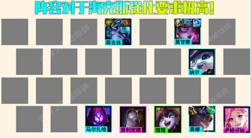 1、阵容组成:璐璐、纳尔、赛娜、莫甘娜、薇古丝、马尔扎哈、萨勒芬妮、发条 2、阵容羁绊:4白魔3名流2黑魔3约德尔 3、海克斯强化: 【必拿】:+1/2名流、名流转职、小泰坦、+1/2白魔、妙手空空、三费之力I/II/III(必拿) 【次选】:狩猎律动、星界赐福、急救用具