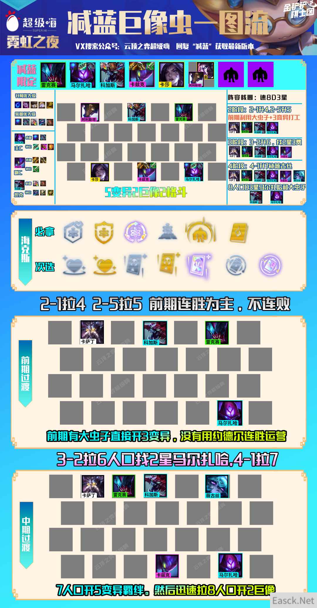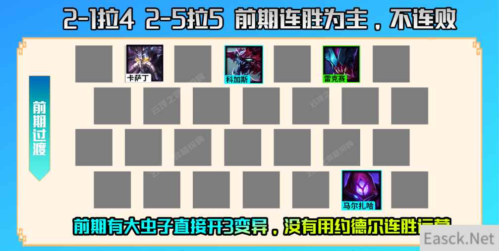 中期阵容:一般情况下选择在3-2直接拉6人口去找2星马尔扎哈,这是非常关键。特别是在2阶段能够5连胜,拉6找2星蚂蚱开3变异稳住连胜。然后再继续攒钱拉7人口开5变异,这样在3、4阶段的强度就已经足够了。 过渡思路是:3阶段找3变异2星马尔扎哈,中期5变异,后期找3星。