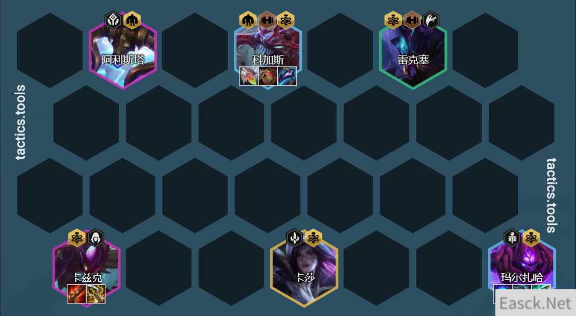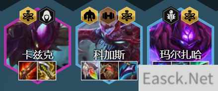 阵容组成:雷克赛、马尔扎哈、科加斯、螳螂、卡莎、牛牛/加里奥 阵容羁绊:5变异2格斗2巨像 海克斯强化(必拿):变异转职、+1/2变异、护甲镀层、不稳定进化 海克斯强化(次选):星界赐福、狩猎律动、复苏之风、三费之力、蓝电池
