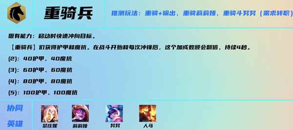 云顶之弈s7重骑兵羁绊介绍,云顶之弈s7重骑兵羁绊效果是什么,云顶之弈游戏中即将更新s7赛季,很多人在游戏中不知道重骑兵的羁绊效果是什么,下面跟着我一起来看看吧,希望此文章能帮到你。 云顶之弈s7重骑兵羁绊效果一览1:重骑兵的效果为,固有能力,移动时快速冲向目标,重骑兵们获得护甲和魔抗,在战斗开始和每次冲锋之后,这个加成数额就会翻倍,持续四秒; 2,四十护甲,四十魔抗; 3,六十护甲,六十魔抗; 4,八十护甲,八十魔抗; 5,一百护甲,一百魔抗;