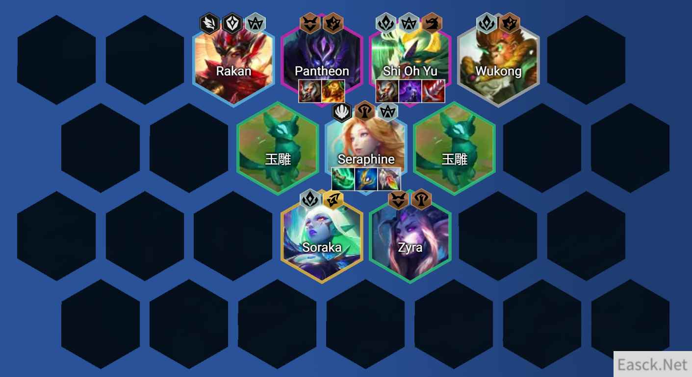 棋子构成:从上倒下从左到右依次为:洛、潘森、石傲玉、孙悟空、萨勒芬妮、索拉卡/贾克斯、婕拉 羁绊组成:5玉龙、3/4秘术(9人口补巴德)、2魔导、2狂刃、2幽影 这套阵容与之前赛季的七仙女、森林法与重秘迦娜这几套阵容类似,属于那种物魔双抗的“铁王八”阵容。