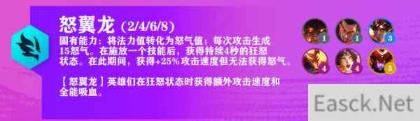 搜牌节奏 3-1大搜,留20继续追3,争取4阶段中期上7级补4怒翼,稳住血量上8找一张希瓦娜就拆掉3金,留2星沃利贝尔观察局势,上9后有亚索下掉沃利贝尔,单补杰斯2换形,巴德2秘术 克制分析 吃牌序,吃装备,吃战力强化符文,3阶段2~3星瑟提有统治力,阵容后期强度看霞、希瓦娜星级和装备,成型不虚所有版本答案,绝对为冷门上分首选 怒翼龙 固有能力:将法力值转化为怒气值;每次攻击生成15怒气 在施放一个技能后,获得持续4秒的狂怒状态:+25%攻击速度但无法获得怒气