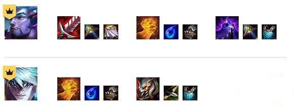 亚索装备给饮血剑、正义之手、夜之锋刃, 盲僧装备给正义之手、泰坦的坚决。