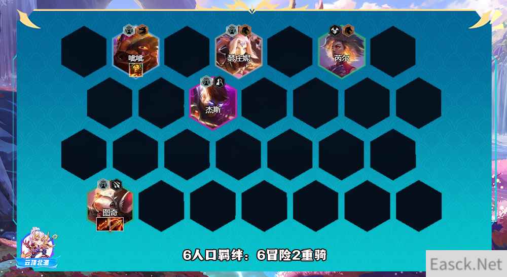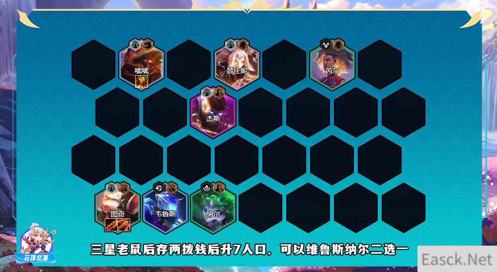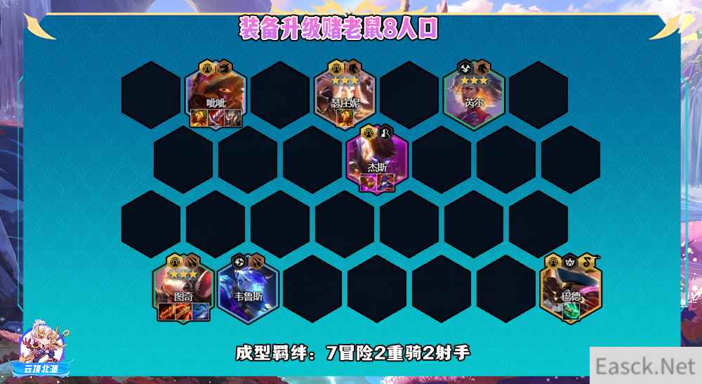 6人口阵容构建用猪妹、老鼠、呲呲、芮尔、杰斯开6冒险2重骑。D不到杰斯先用维鲁斯。 阵容选择在6人口慢D三星老鼠,同时D三星猪妹和芮尔。这个人口老鼠带冒险升级不太需要射手的攻速加成,选择芮尔提升前排坦度性价比最高。 7人口以此基础上补一个维鲁斯打控制。 8人口D一张巴德阵容就大成。