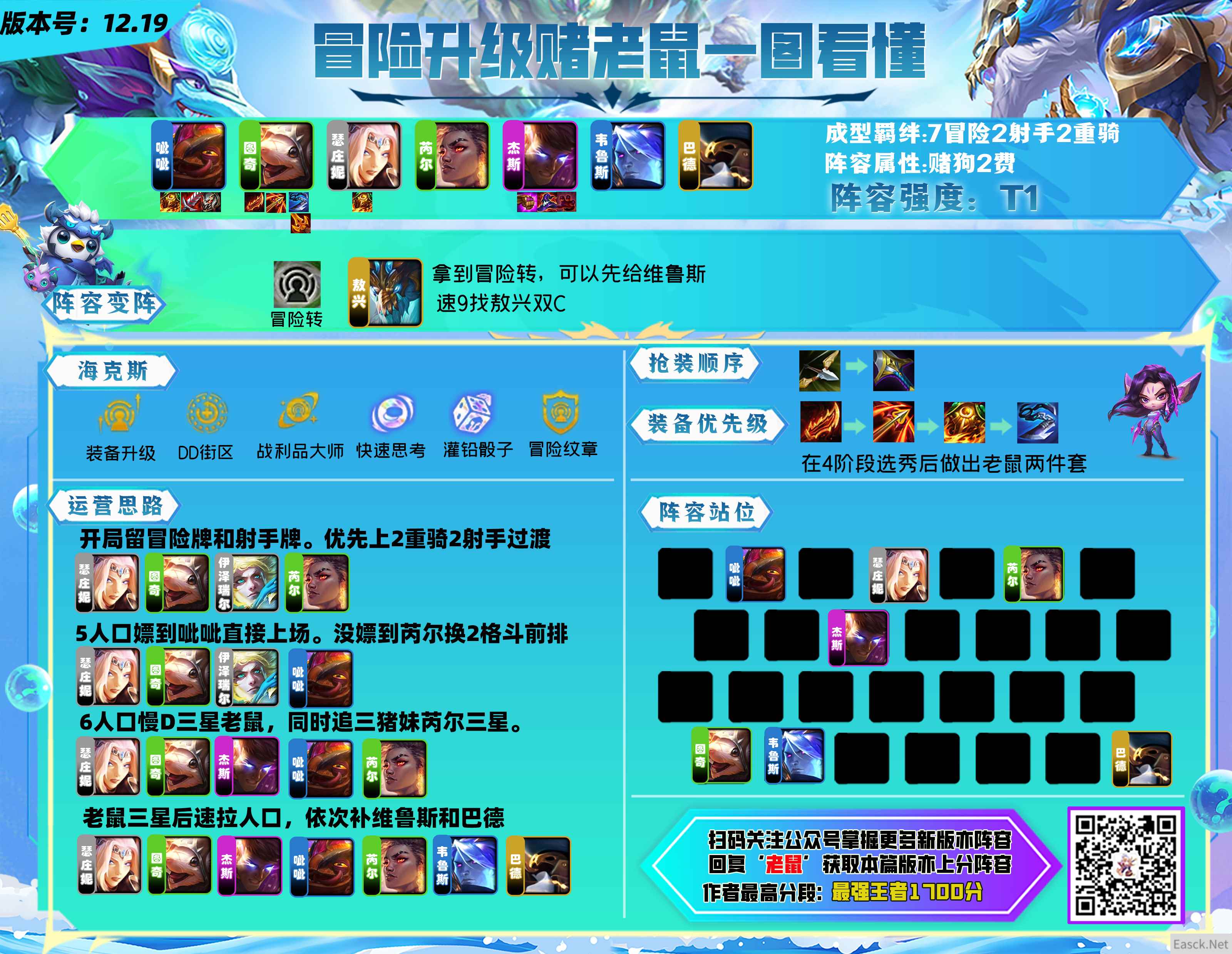 本篇内容给大家安利一套开局拿到冒险升级海克斯,赌老鼠的玩法。 冒险家单位携带装备后不光可以获得额外的护甲,还可以享受2.5倍的基础加成。 简单点说就是老鼠带装备额外可以获得2.5倍的攻速,猪妹获得额外2.5倍血量,呲呲对应的是双抗,杰斯加成的是攻击和法强,巴德是回蓝,有冒险转单位对应的是回复。 重点来了!拿到这个海克斯后,再配合高冒险的加成,老鼠可以在开局直接获得2.5以上攻速,配合装备羊刀和分裂,能打出高频率的伤害,中期两星老鼠可以无脑连胜,追出三星轻松吃分。