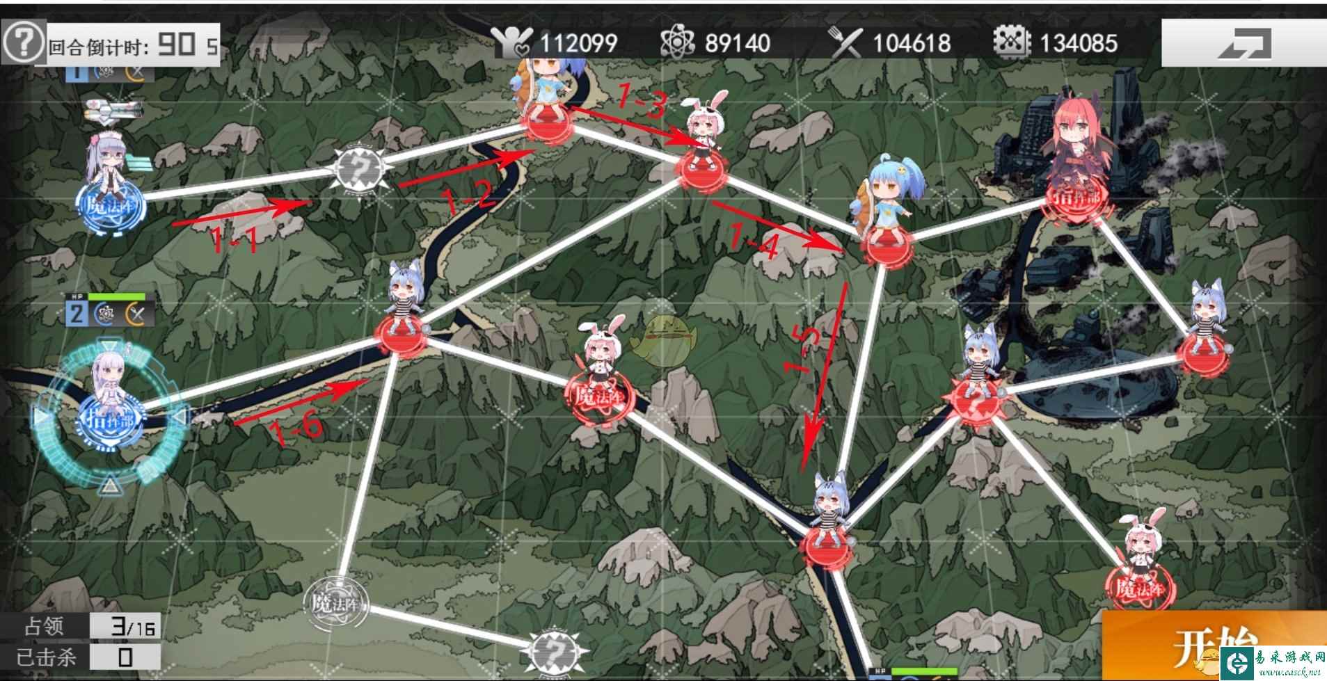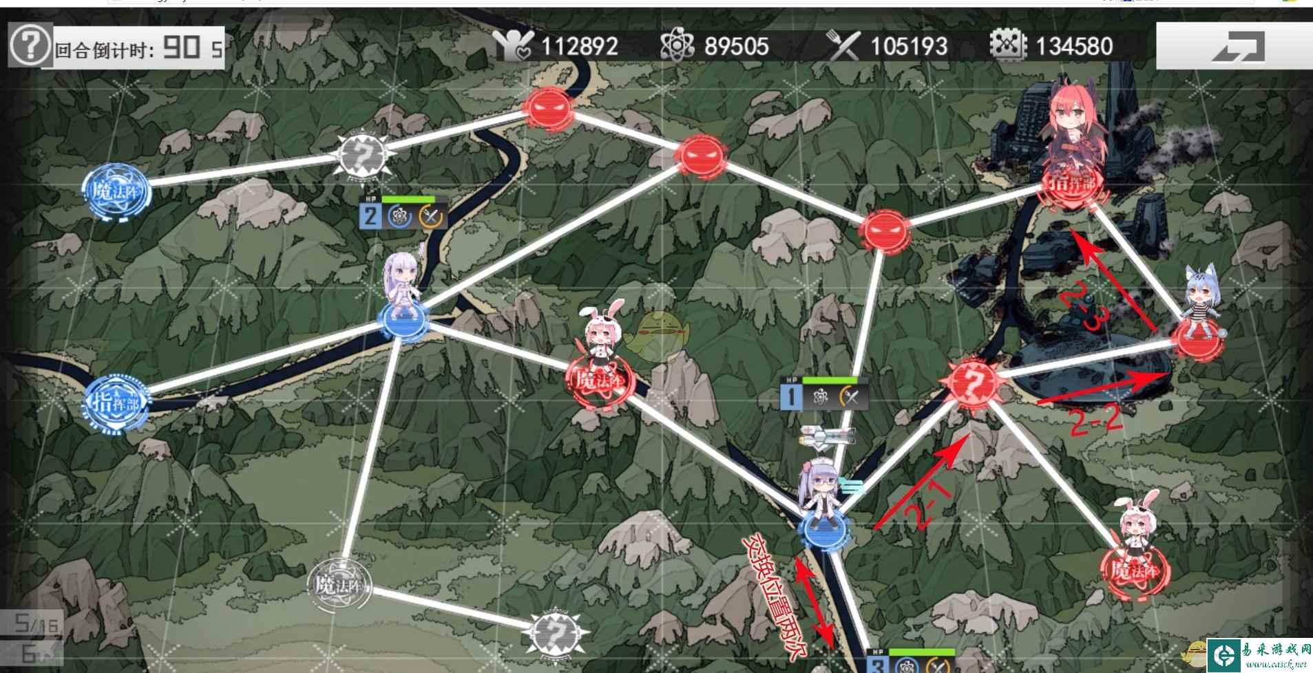 第一回合 指挥部梯队2,上魔法阵梯队1,下魔法阵梯队3 1、梯队2,往右走一格格子。 2、梯队1,往右走4个格子再往下走一格。 第二回合 1、梯队1、梯队3交换位置,然后再次交换回来(作用是补充梯队1资源,不消耗行动点) 2、梯队1向右走两格,在向上走一格,击败BOSS占领指挥部即可S胜 |