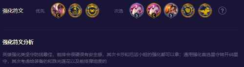 【符文推荐】 1、英雄强化类坚守防线最佳,前排会很硬很有安全感,其次卡莎和厄运小姐的强化都可以拿。 2、通用强化首选星守转开68星守,其次考虑给装备的和珠光莲花以及前排撑坦度的。