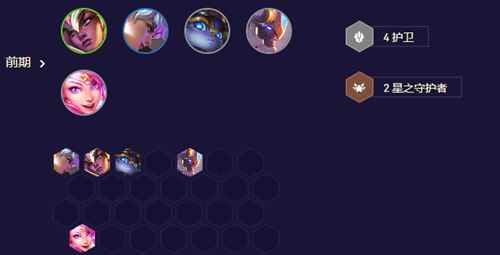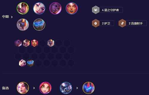 【早期过渡】 1、开局发星守转直接拿,留孙悟空+波比+任意2星长手,最好是拉克丝,来卡莎换掉后排,来芮尔换掉前排。 2、也可以开4护卫或者保留2护卫+怪兽前排,2-1升4,2-5升5,3-2升6 【前期过渡】