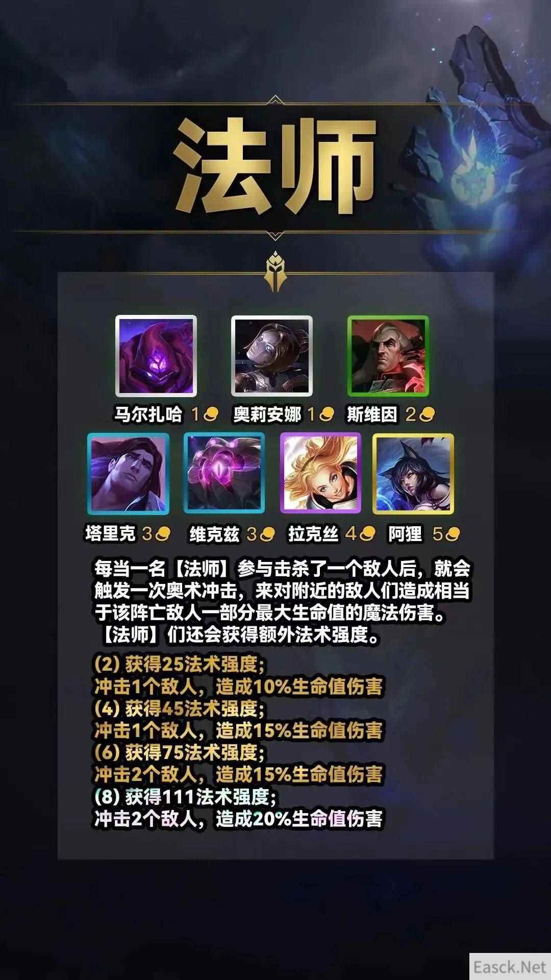 详细答案:法师(2/4/6/8) 法师获得额外25/50/80/111法术强度。 当敌人阵亡前的3秒内曾受到法师的伤害,法师会对另外1/1/2/2名敌人造成该阵亡敌人10/15/15/20%最大生命值的魔法伤害。 英雄: 玛尔扎哈,奥莉安娜,斯维因,塔里克,维克兹,拉克丝,阿狸