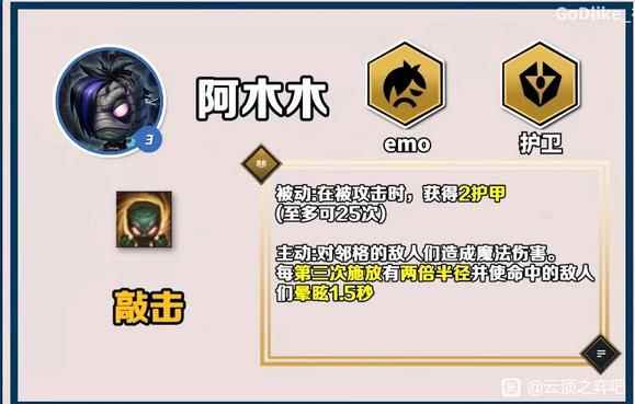 云顶之弈S10版本快上线了,在S10版本会新增和替换所有的棋子,这些棋子都有自己独特的技能,比如阿木木,那么云顶之弈S10阿木木技能是什么?下面就给大家带来云顶之弈S10阿木木技能介绍。 云顶之弈S10阿木木技能介绍阿木木:三次技能有个强化大看数值吧,数值高点有说法