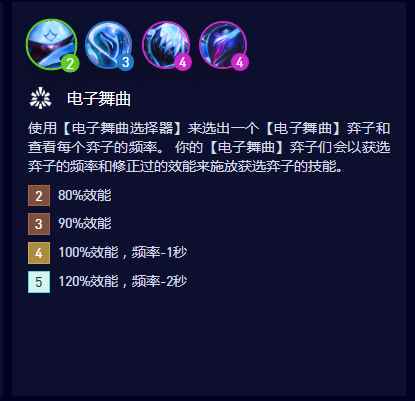 云顶之弈S10赛季已经开始了,在S10赛季新增了很多棋子的羁绊,比如电子舞曲,那么云顶之弈S10电子舞曲羁绊属性是什么?下面就给大家带来云顶之弈S10电子舞曲羁绊属性介绍。 云顶之弈S10电子舞曲羁绊属性介绍使用【电子舞曲选择器】来选出一个【电子舞曲】弈子和查看每个弈子的频率。 你的【电子舞曲】弈子们会以获选弈子的频率和修正过的效能来施放获选弈子的技能。 2:80%效能 3:90%效能 4:100%效能,频率-1秒 5:120%效能,频率-2秒