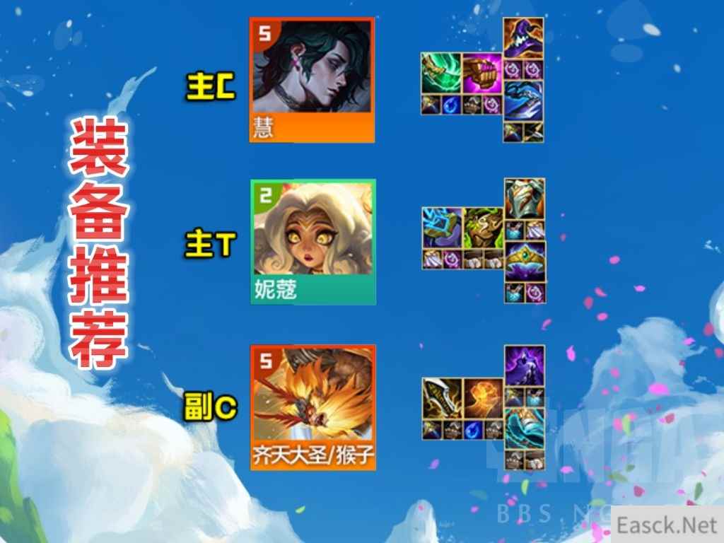 装备推荐 法系C彗/2星莫甘娜:青龙刀+法爆+帽子(可替换任意输出装) 主T妮蔻/黛安娜:离子+狂徒关键(第三件补冕卫、板甲、救赎等肉装,可以做两套) 物理C悟空:无尽+正义+夜刃/破防(能把暴击拉满) 溢出物理:李青享受饮血泰坦等通用物理装待遇 溢出法强:洛享受科技枪、法爆等通用法系装待遇