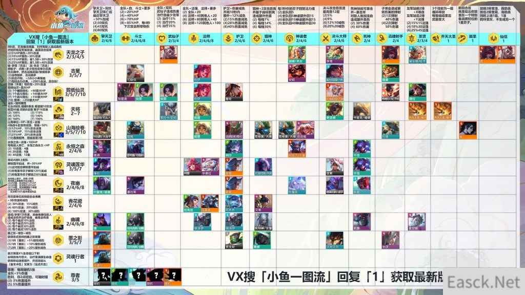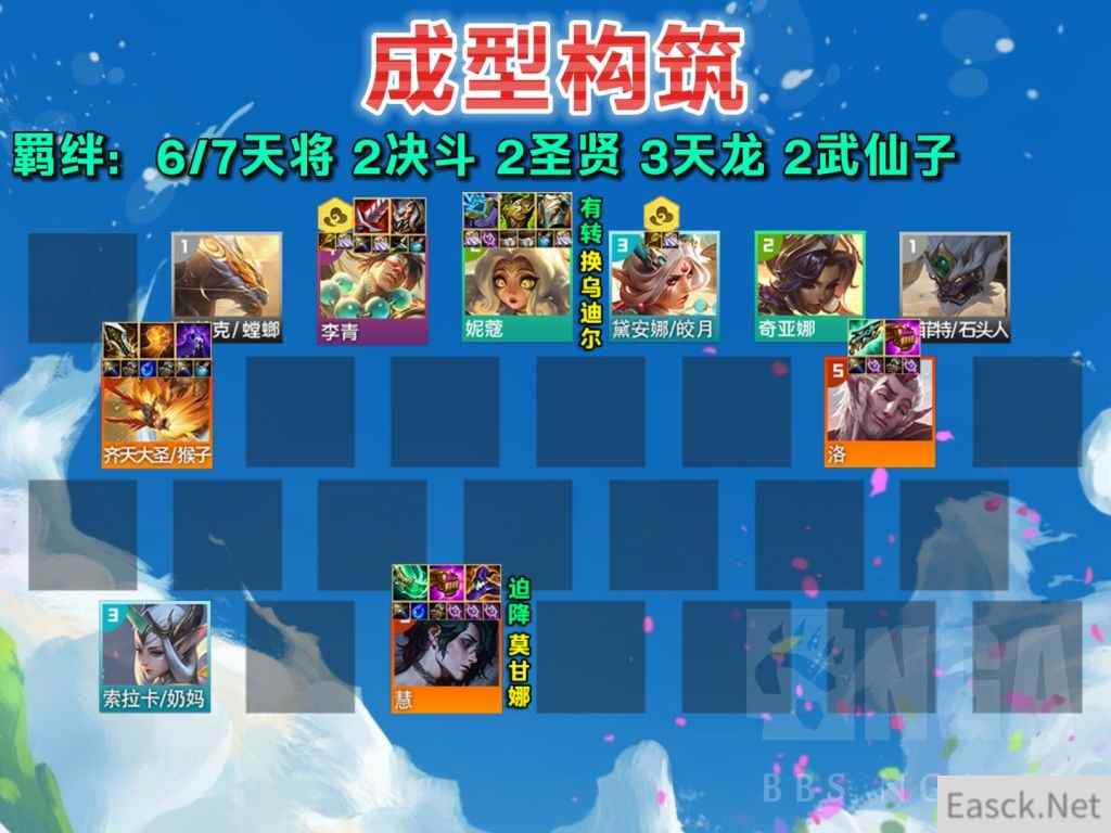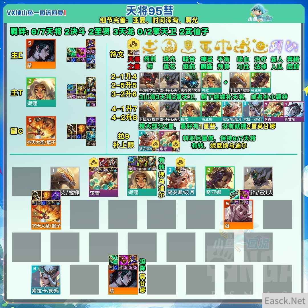 阵容构筑 4-2升8和上9上10是不是胡扯:首先S10强音争霸赛季,最热门的心之钢EZ爵士95,是不是4-2升8抢天选和大部分2星锁血,那S11画中灵4-2升8搜质量锁血有没有问题;其次S11画中灵赛季新增每局3-5个奇遇事件,新增很多经济符文,再加上保留的传送门系统,以及8上9少8点经验,9上10少14点经验,非3个银符文的对局,9级吃分已成标准,上10级并不是胡扯 成型构筑:天将全上,补黛安娜+李青+洛3天龙2圣贤,至此以上全是团队BUFF羁绊,并且包含一位猴子物理大C,一位洛法系大C,除这些人以外,后排我们还需要挂一位法系大C——彗,如果没有就上2星莫甘娜,这样还有3圣贤,玩到结束强度也没问题 铲子无脑抢:高天将=老赛季高冒险家,天将转能提供全队全能吸血,天将上的越多,等于全队加高额暴击、双抗、血量、攻击力、法强、攻速、吸血,有铲子+魔抗就疯狂合,全队属性蹭蹭往上涨 1个转:刚好能开出7天将,构筑不变,但如果有2星乌迪尔也值得替换掉妮蔻 2个转:天将羁绊会溢出,把妮蔻换成1星乌迪尔,这样有2擎天卫,并且乌迪尔是究极搅屎棍