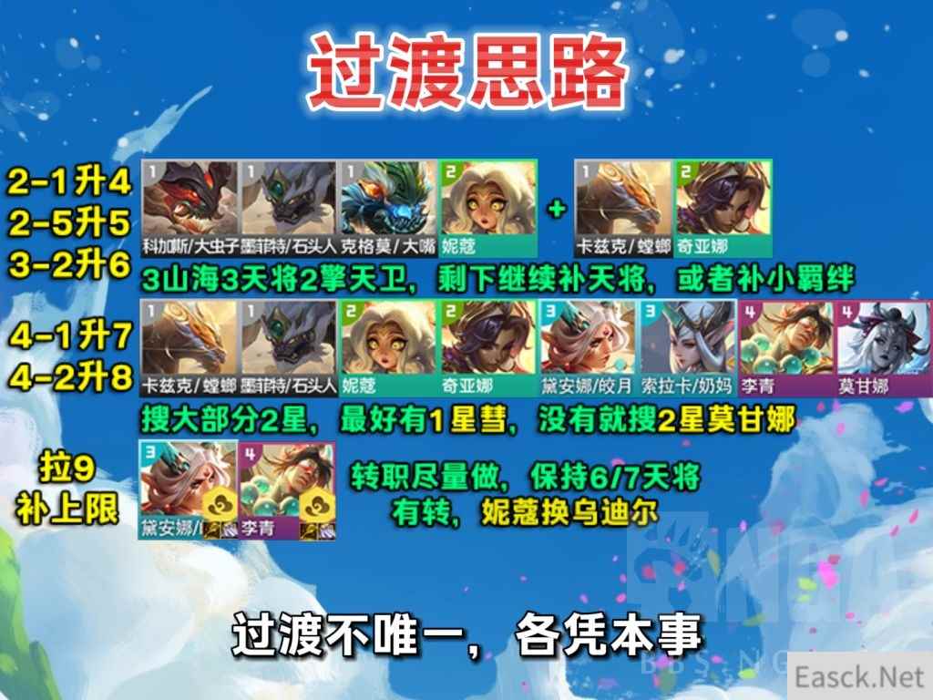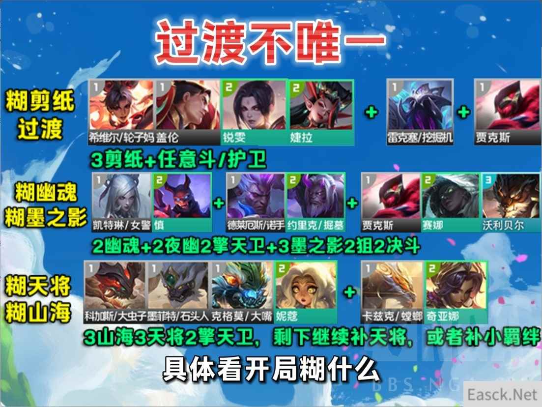 过渡各凭本事 过渡思路并不唯一,主打开局糊什么上什么,如果你糊剪纸那就3剪纸拼护卫斗士过渡;如果你糊女警那就幽魂墨之影过渡