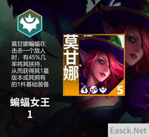 云顶之弈S12魔法大乱斗上线了,在新赛季会增加很多新的羁绊和棋子,还有不少老羁绊,老英雄的回归,那么有不少小伙伴好奇都有哪些羁绊效果,下面就给大家带来s12蝙蝠女王羁绊效果一览。 云顶之弈s12蝙蝠女王羁绊效果是什么蝙蝠女王 莫甘娜蝙蝠在击杀一个敌人时,有45%几率将其挟持,从而获得其1星版本或其拥有的1件基础装备。 棋子:莫甘娜