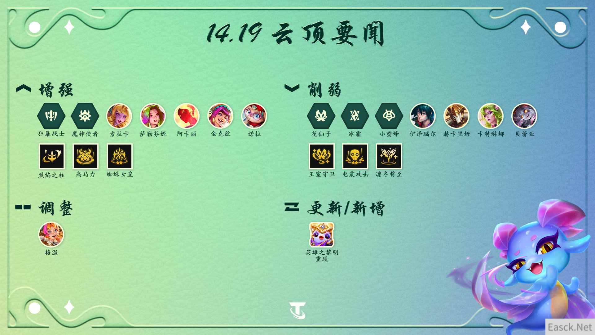就在最近云顶之弈官方放出了对于14.19版本的更新内容,这次更新有许多英雄进行了调整,还有不少的羁绊进行调整,以及bug的修复,那么下面就给大家带来云顶之弈14.19BUG修复一览。