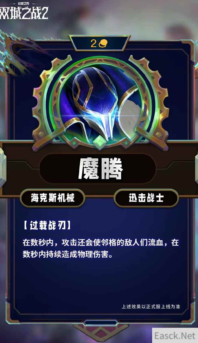 云顶之弈S13快上线了,新赛季的主题是双城之战2,新增了很多新的棋子,比如魔腾,那么云顶之弈S13魔腾技能是什么?下面就给大家带来云顶之弈S13魔腾技能效果一览。 云顶之弈S13魔腾技能效果一览魔腾 海克斯机械,迅击战士 法力值:0/40 接下来的6秒,攻击对邻格的敌人施加流血效果,持续1秒,共造成120/120/140%攻击(+15/25/40)物理伤害。