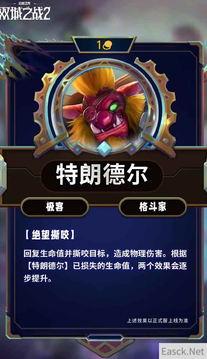 云顶之弈S13快上线了,新赛季的主题是双城之战2,新增了很多新的棋子,比如特朗德尔,那么云顶之弈S13特朗德尔技能是什么?下面就给大家带来云顶之弈S13特朗德尔技能效果一览。 云顶之弈S13特朗德尔技能效果一览特朗德尔 极客,格斗家 法力值:30/90 治疗自身160/190/230生命值,对敌人造成280%攻击物理伤害。这些效果基于自身已损失的生命值最多提升75%。