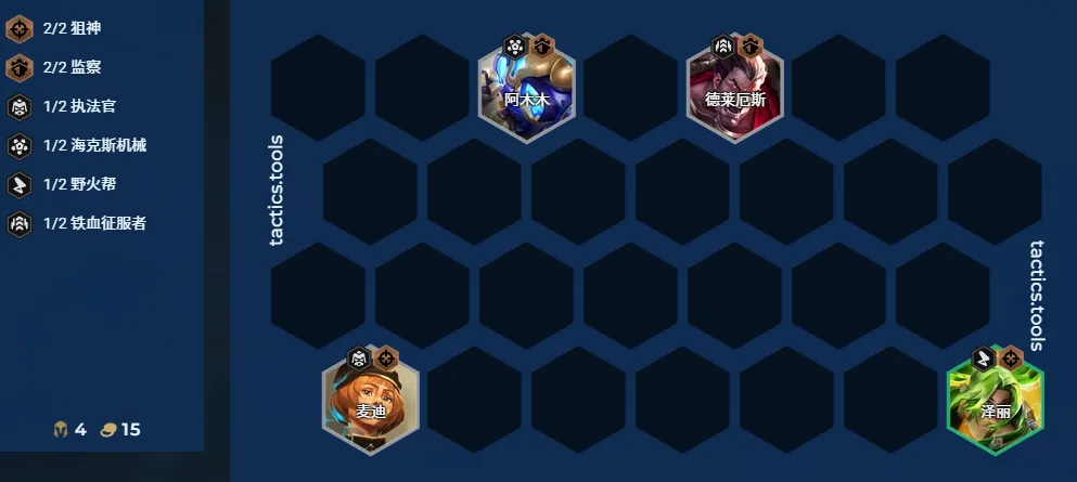 5人口(2-5)选秀拿水滴或棒子等法系输出装; 6人口(3-2)可以小搜两下开出4监察,最好找到克格莫,不搜也没问题,有什么上什么。