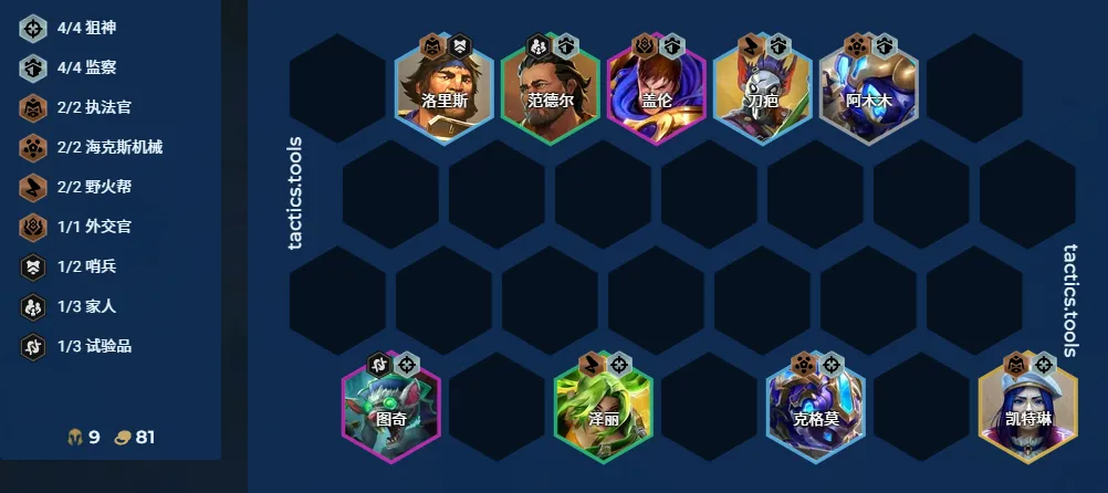 本来是不打算推这套阵容,有bug嫌疑,而且监察双狙之前也出过,但既然这个版本直接上正式服,还是让更多人了解下吧。 另外,在传统的监察大嘴阵容中,泽丽承担副C的输出,在满足大嘴和前排装的情况下,也要把她追三星并找装备,但在千刀斩大嘴体系中,她基本没机会输出,因此第三套装备尽量再找肉装。 细节2:灵活变阵 这套体系不需要变阵,八级打到底,除了追刀疤,也可以顺手追范德尔;正常玩的小伙伴也可以尝试4狙+4监察的组合,(有狙转时考虑)。
