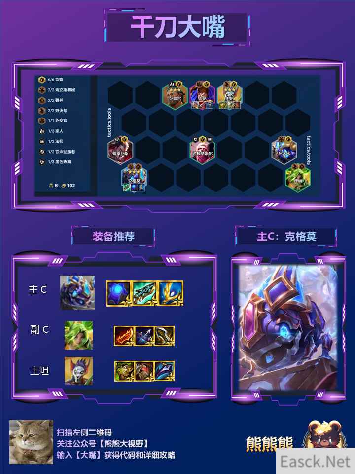 细节1:新版本阵容核心单卡/羁绊解析 主C%20克格莫:大嘴的技能是普工造成额外法系伤害,每释放一次技能可以叠加攻速,同时增加攻击距离,基本上全程大嘴都不需要动,站角落喷人就行,且攻速会越来越快。 我们首先需要给他一件启动装(蓝buf)让他快速启动叠加攻速,其实带大天使保证残局输出最大化; 科技枪也是非常刚需的一件装备,前排全是监察卡,自带减伤效果,对血量需求高,科技枪正好可以帮助回血,极大增强了坦度和容错。