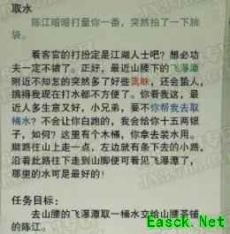 详细答案: 在少林地图NPC陈江处接到任务《取水》。任务目标:去山腰的飞瀑潭取一桶水交给山腰茶铺的陈江。