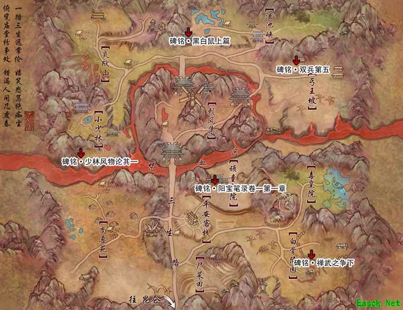 剑网3怀旧服是很多人关注的热点,很多人对于游戏里的很多细节不清楚,那么剑网3怀旧服恶人谷碑铭在哪里?下面就将带来剑3怀旧服恶人谷碑铭抄书点分布位置。 《剑网3》怀旧服恶人谷碑铭在哪恶人谷碑铭(5) 碑铭名称 抄录等级 所需材料 碑铭地址 阅读等级 分类等级 黑白鼠上篇 70 佛学63 粉蜡笺1、徽墨1、谷帘泉1、毛皮2 见图示 禅武之争下 70 佛学63 粉蜡笺1、徽墨1、趵突泉1、毛皮2 见图示 少林风物论其一 70 佛学63 粉蜡笺1、徽墨1、谷帘泉1、毛皮2 见图示 阳宝笔录卷一第一章 70 杂集68 粉蜡笺1、徽墨1、谷帘泉1、毛皮2 见图示 双兵第五 70 杂集68 粉蜡笺1、徽墨1、趵突泉1、毛皮2 见图示