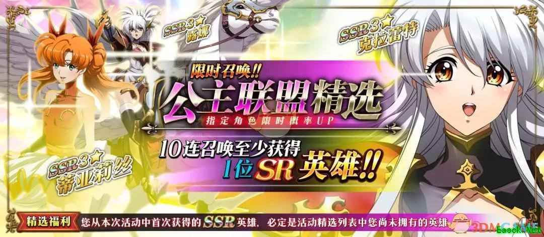 活动时间:7月25日10:00-8月7日23:59 限时召唤[公主联盟精选]开启,在SSR英雄中克拉蕾特、蒂亚莉丝、露娜出现概率提升! 精选福利 你从本次活动中首次抽取到的SSR英雄,必定是活动精选列表中你尚未拥有的SSR英雄。 在本期卡池中,抽到的活动UP英雄已经满星级时,可同时获得“时空精粹”,使用该道具以及满星活动英雄的记忆碎片可以等量兑换同期UP的其他的英雄的记忆碎片,每个英雄可兑换2次。详情见活动开启时游戏内公告。