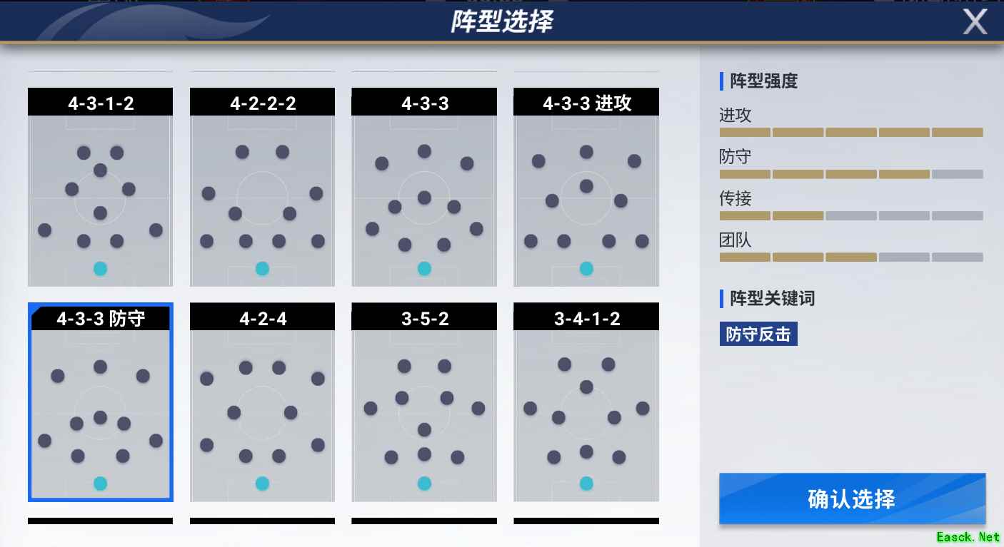 2.防守反击4-3-3防守:现实生活中,强队都非常钟爱4-3-3系列阵型,今天要推荐的则是4-3-3防守。双后腰的设定让这套阵型的防守端变得非常省心,面对边路进攻,后腰可以补防边路及时封堵对手的传中球;面对中路突进,双后腰能高效地执行协防逼抢,并第一时间传递给前锋实现快速反击。而且值得一提的事,第二天登录送莫德里奇、新人计划免费领托尼克罗斯、6元即可带走卡塞米罗,4-3-3防守的中场人选已经完美预定了。
