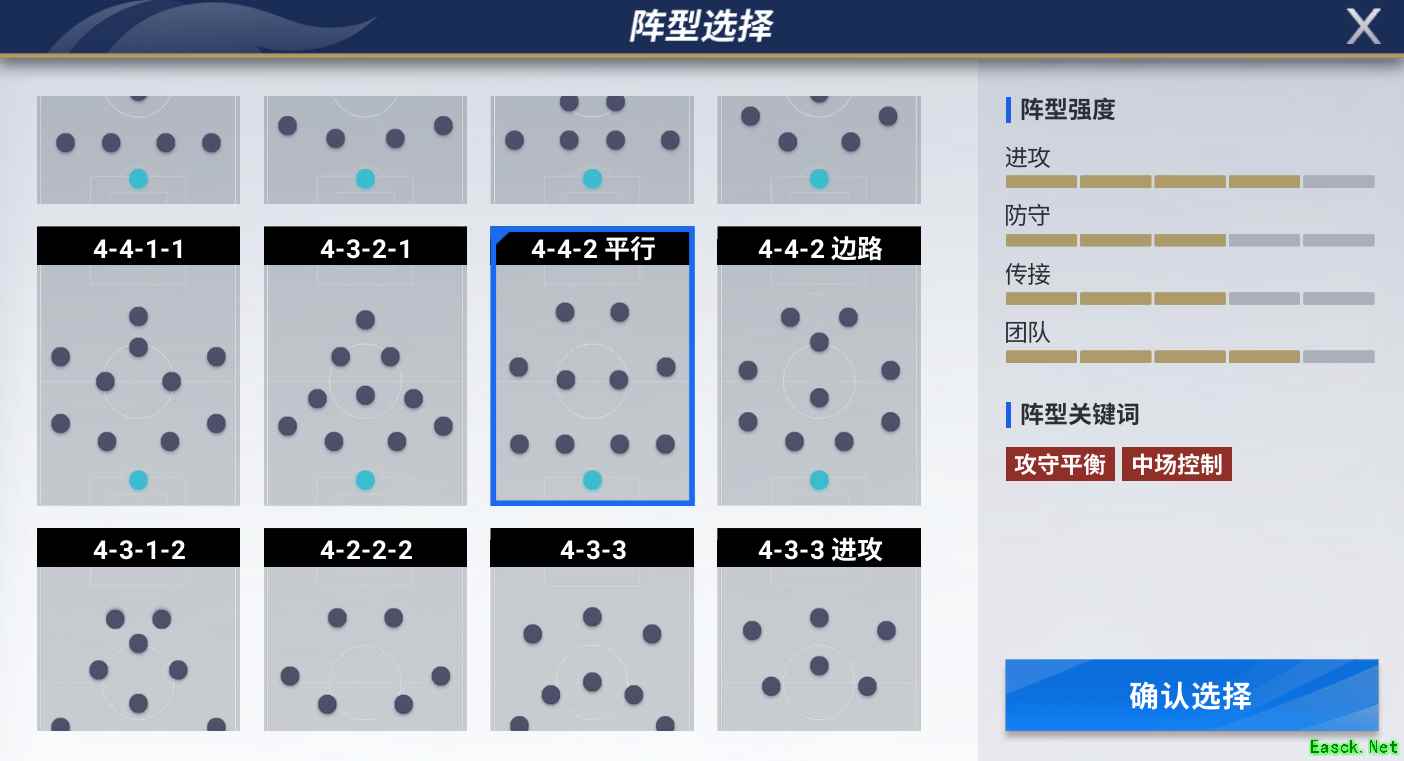 4.攻守平衡4-4-2平行:4-4-2平行是一套非常受欢迎的攻守平衡阵型。相较于4-2-4,两个边前卫可以积极参与防守,边路不容易被直塞穿透;相较于4-3-3,四个中场球员对中场区域的控制力更强,遇到对手积极的逼抢协防也能通过传导进行换边进攻。同时4-4-2平行的进攻可能性也非常丰富,既可以配置双高中锋配合边路快马进行传中头球争顶、也可以配置善于传球盘带的中锋,以加强双中锋之间的传导配合。
