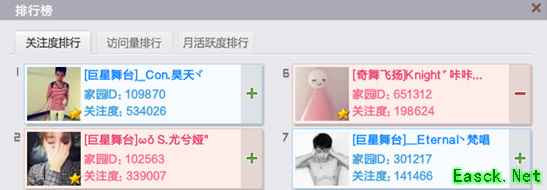 ④排行榜 进入家园后,在上方导航条找到“排行”可以查看当月的关注度、访问量和月活跃度排行榜。
