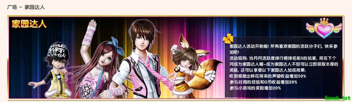 ③家园达人 每月会根据上一个月全大区每位玩家的家园月活跃度,评选出大区前5名,当选家园达人。进入家园后,在 上方导航条找到“广场”,在里面找到家园达人即可进入页面: