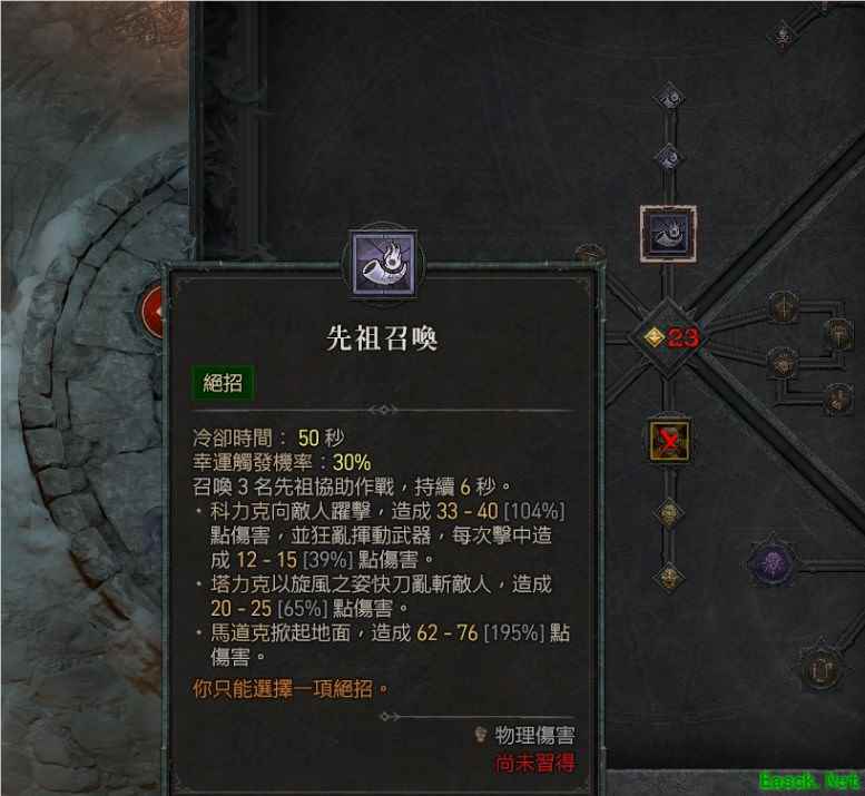1. 基本技能:猛扑攻击是非常重要的基本技能,除了不错的伤害之外,它附加的位移效果与闪避交替使用,是野蛮人前期保持机动力的核心技能,非常好用,另外强化后附加的流血伤害也跟撕裂流主题非常地搭。 2. 核心技能:小编知道大家都很想玩旋风斩,不过初期我们还是专心点撕裂就好。 3. 防御技能:振奋战吼带来大量的移动速度加成与怒气生成,对野蛮人来说是不可或缺的一个技能。 4. 争斗技能:这层我们使用战吼来进一步增加伤害与提供狂暴状态。 5. 武器专精技能:选择死亡之击来提高对单体目标伤害与产生更多的怒气。 6. 绝招技能:这招带来的伤害与回怒有多好用就先不提了,二代的野人祖先三本柱与你共同作战,这难道不值得点吗? 7. 关键被动技能:无拘狂怒是我们在建立完整的怒气生成体系之后,最佳的泄怒增伤选择。 点击顺序上,20级前点满撕裂与相关技能,把战吼系技能与死亡之击都点出来,之后开始点先祖召唤相关技能与补满死亡之击,之后再开始去补其他的技能与被动。