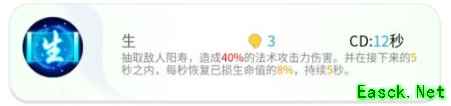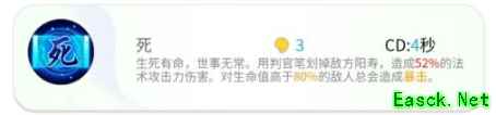 死(消耗3豆,CD4秒): 生死有命,世事无常。用判官笔划掉敌方阳寿,造成52%的法术攻击力伤害。对生命值高于80%的敌人总会造成暴击。