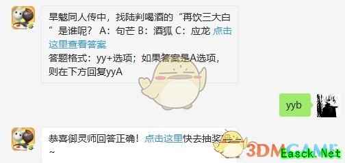 一起来捉妖8月2日每日一题 旱魃同人传中,找陆判喝酒的“再饮三大白”是谁呢? A:句芒 B:酒狐 C:应龙 答案: yyB 每日一题幸运扭蛋机规则说明 1、关注一起来捉妖微信公众号并绑定游戏账号才可参与签到(仅限微信用户) 2、每个账号参与【每日一题】并回答正确后仅能获得一次抽奖机会。 3、【每日一题】奖励直接发放到游戏账号,通关邮箱进行收取。 本活动最终解释权归腾讯公司所有。 以上就是小编为大家分享的一起来捉妖8月2日微信每日一题答案,希望对各位玩家在每日一题幸运扭蛋机中能获得自己想要的奖励。更多一起来捉妖攻略,请关注手游网,小编将持续为你更新。 |