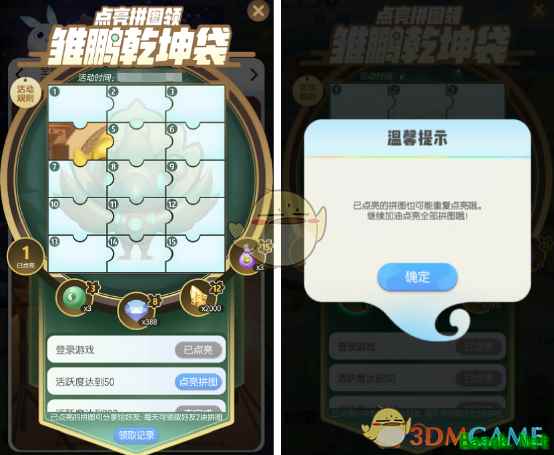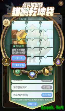 1、【每日登录游戏】、【活跃度达到50点】、【活跃度达到100点】,均可获得1次解锁拼图碎片的机会(每日通过任务可获得3次,任务次数将于次日05:00重置) 2、点击对应任务的【点亮拼图】按钮后,将会随机激活一块拼图(有概率激活重复的拼图) (2)通过好友分享的碎片获取