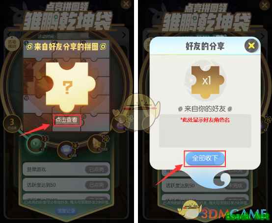 3、返回游戏活动后,点击【点击查看】-【全部收下】,将会直接激活刚刚领取的对应编号拼图(即使领取了碎片后未登录游戏,系统也会自动累计有效获得的碎片数量) 4、若领取好友拼图返回游戏后未出现领取界面,可尝试重登游戏后再次进入活动界面 五、奖励领取