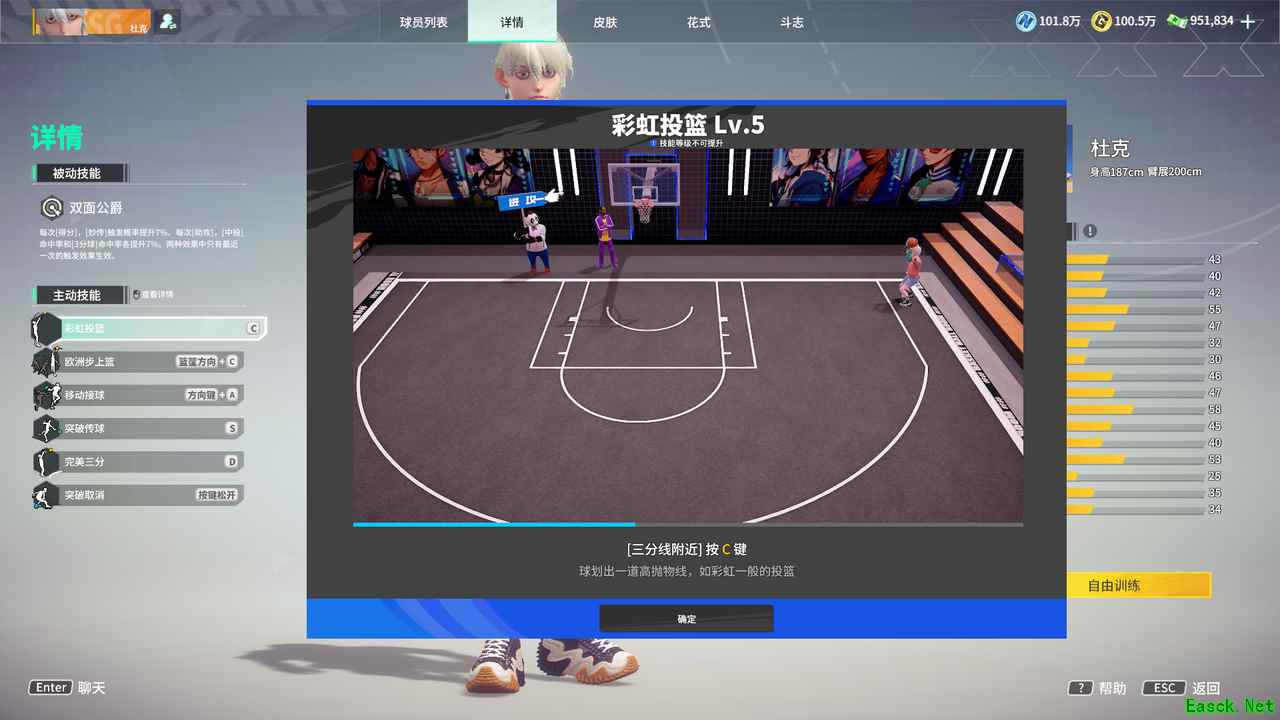 主动技能 【彩虹投篮】:球划出一道完美的高抛物线,如彩虹一般的投篮(在三分线附近按 C 键)