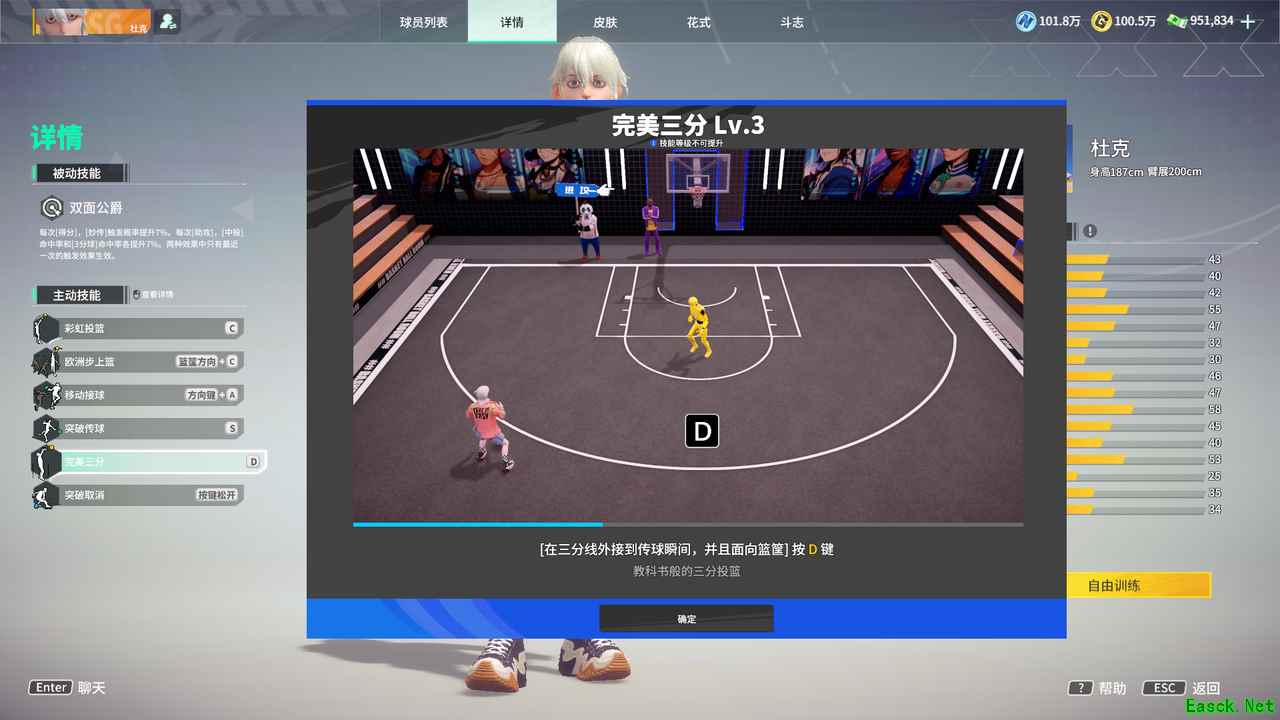 【完美三分】:教科书版的三分投篮(在三分线外接到球的瞬间,并且面向篮筐,按 D 键)