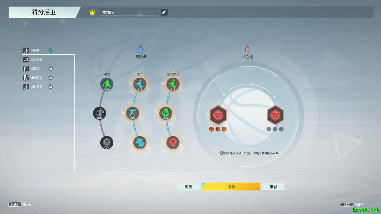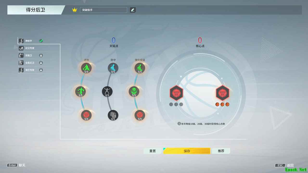 天赋推荐【神射手】,核心点【稳健射手】,天赋点主加【进攻】和【强化投篮】,这样的搭配,可以提升杜克的投射能力和突破能力,能够在对局中有获得更多得分的机会。