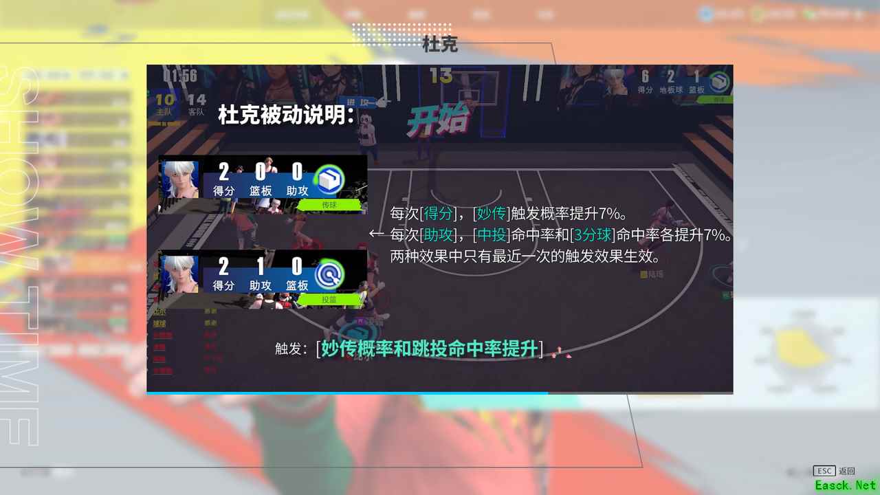 杜克在游戏中的定位是得分后卫(SG)顾名思义,他的主要职责就是得分,具有极强的得分能力。 通过杜克的属性面板可以看出各项数值较为均衡,没有特别明显的短板。 杜克拥有多样化的得分手段,突破上篮,外线三分投篮,其中最擅长的三分投射. 在对局中杜克要积极的跑动,找到空位直接三分出手,不能浪投,多和队友配合,尽可能找到空位的出手机会,或者和中锋打好挡拆战术借掩护直接突破上篮或分球。 技能介绍 被动技能 【双面公爵】:每次得分,[妙传]触发概率提升 7%,每次助攻,[中投]命中率和[3分球]命中率各提升 7%。 需要注意两种效果只有最近一次的触发效果生效。