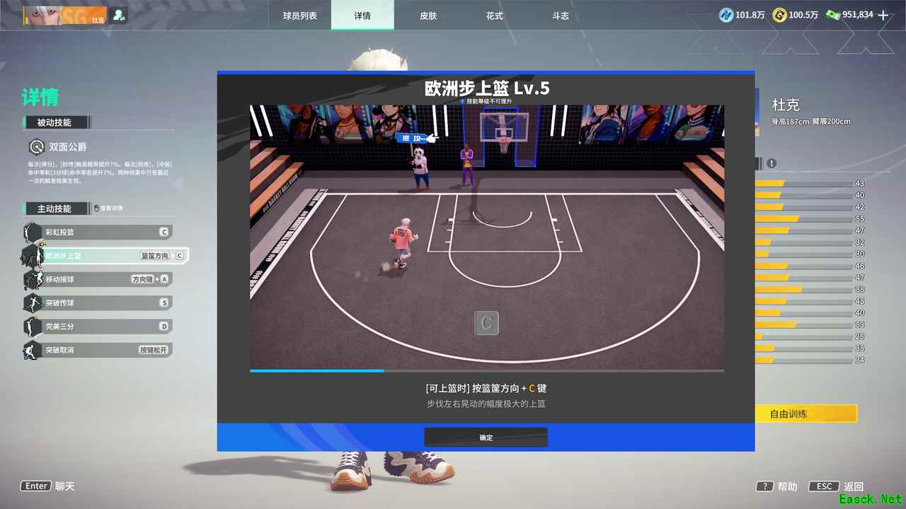【欧洲步上篮】:步伐左右晃动的幅度极大的上篮(可上篮时按篮筐方向键+C 键)