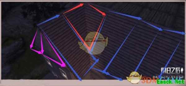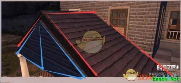 蓝色的是2型斜面墙,红色的是2型屋顶。这里要注意的是,优先做后面房子的墙,然后再放屋顶,因为这个游戏目前的建筑经常会卡住,先后顺序乱了就放不了东西很尴尬。 再来看看顶楼的屋顶,这里用的是1型斜面墙+1型屋顶+1型凹角屋顶。